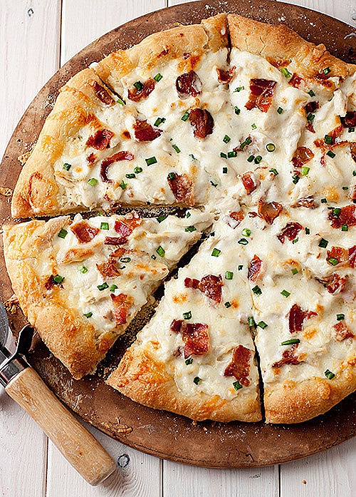 Выложить на основу для пиццы соус, цыпленка и половину сыра. Разогреть гриль до 450С. Установить решетку, сверху положить камень для пиццы. На камень положить подготовленную пиццу и выпекать в течение 12 минут.